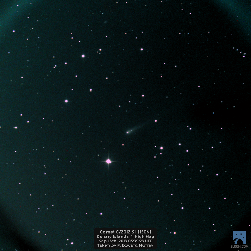 Nach einer sehr zweifelhaften und nicht bestätigten Sichtung am 07.08.2013 wurde Komet ISON am 12.08.2013 von dem britischen Amateurastronomen Bruce Gary erstmals nach der Konjunktion mit der Sonne definitiv wieder beobachtet und fotografiert. Gary selber gelang am 16.08.2013 die dringend erwartete Bestätigung. C/2012 S1 befand sich mit einer Helligkeit von etwa 14 mag im Bereich dessen, was für diesen Zeitpunkt zu erwarten gewesen war. Derweil waren weitere Infos zu den Beobachtungen mit dem Spitzer-Teleskop im Juni sowie ein Kalender der geplanten wissenschaftlichen Beobachtungen erschienen. Ab Mitte August wurde Komet Ison vielfach beobachtet und fotografiert, u.a. mit dem 1.8m VATT-Teleskop in Arizona. Dadurch wurde recht deutlich, dass seine Helligkeitsentwicklung der Ephemeride des MPC weitgehend entsprach. Unverstädlicherweise wurden dennoch zahlreiche Abgesänge auf den Schweifstern publiziert, u.a. von der renommierten Sky & Telescope. Möglicherweise sorgte die starke Streuung der Helligkeitsschätzungen, welche durch die bis dahin ungünstige Position des Kometen am Morgenhimmel bedingt worden sein dürfte, für Irritationen. Letztlich waren jedoch alle Spekulationen müßig, denn wenn sich Ison nicht vorzeitig komplett auflösen würde, würde sich erst nach der Perihelpassage Anfang Dezember herausstellen, wie er am irdischen Himmel in Erscheinung träte. Selbst seriöse wissenschaftliche Publikationen wie diese konnten nicht mehr als ein paar Anhaltspunkte vermitteln. Eine weitere neue Arbeit beschäftigte sich mit dem Ausgasungsverhalten von C/2012 S1 zwischen September 2012 und Juni 2013. Uwe Pilz hatte sich erste Gedanken über die mögliche Schweifentwicklung von C/2012 S1 gemacht (pdf zum Download, 181 kb). Einen Rückschlag musste derweil die CIOC hinnehmen, denn die geplanten Beobachtungen mit der Sonde Deep Impact scheiterten an derem plötzlichem Ausfall. Kurz danach wurde das betagte Raumfahrzeug offiziell aufgegeben. Anfang September 2013 erschien im Oculum-Verlag eine kleine Broschüre zu Komet Ison, welche auch kostenlos als Online-Version zur Verfügung gestellt wurde. Weitere erwähnenswerte Online-Publikationen zu C/2012 S1 brachten Andreas Schnabel sowie der in Sachen Astronomie seit Jahren sehr engagierte Bayerische Rundfunk heraus. In der letzten Septemberwoche und in der ersten Oktoberwoche erschienen von Tag zu Tag mehr Fotos des Kometen Ison. Da er am Morgenhimmel allmählich höher stieg und seine Helligkeit bereits um die 11 mag betrug, war er zu nun für zahlreiche Amateurastronomen zu einem Beobachtungsobjekt geworden. Daneben wurden aber auch professionelle Bilder veröffentlicht, die u.a. an einem 2m-Teleskop gewonnen wurden. Mit 2P/Encke und dem erst am 06.09.2013 entdeckten C/2013 R1 (Lovejoy) tummelten sich zwei weitere, ebenfalls um 11 mag helle Schweifsterne am Morgenhimmel. C/2012 S1 präsentierte sich mit einer grünlichen Koma und einem ebenso gefärbten Gasschweif. Die Farbe entstand durch die Anregung von Dicarbon (C2) und/oder Cyan (CN). Obwohl kein Zweifel bestand, dass Isons Helligkeit stetig zunahm, erregte kurzzeitig ein Aufsatz des in der Fachszene für seine Außenseitermeinungen bekannten Ignacio Ferrín Aufsehen, in dem die unmittelbar bevorstehenden Auflösung des Kometenkerns postuliert wurde.