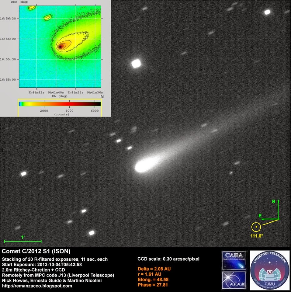 Die Diskussionen über die fragwürdigen Hypothesen von Ignacio Ferrin setzten sich fort. Nachdem die Lage der Rotationsachse des Kometenkerns mit einiger Sicherheit bestimmt worden war, stieg jedenfalls die Wahrscheinlichkeit, dass C/2012 S1 die Perihelpassage einigermaßen intakt überstehen könnte. In einer aktuellen Arbeit verglich Zdenek Sekanina Ison mit den Kometen C/2002 O4 (Hönig), der sich relativ weit entfernt von der Sonne aufgelöst hatte, und C/1962 C1 (Seki-Lines), welcher eine enge Sonnenbegegnung unversehrt überstanden hatte. Der Autor kam zu dem Schluss, das Ison eher Seki-Lines ähneln würde. Die Universität Bonn veröffentlichte eine Pressemitteilung zur Kometenzeit in Bonn. Mitte Oktober stand die Begegnung von Komet Ison mit Mars und Regulus im Fokus der Astro-Fotografen. Dass ab dem 18.10.13 helles Mondlicht die Beobachtung des Kometen empfindlich störte, hielt erfahrene Fotografen nicht davon ab, Isons Entwicklung weiter zu dokumentieren. Die Helligkeitsschätzungen klafften in diesen Tagen weit auseinander, zwischen 8.8 mag (visuell) und 11.8 mag (CCD). Aktuelle Helligkeitskurven belegten aber, dass Ison um den 20.10.13 ziemlich genau bei 10 mag lag. Ignacio Ferrin heizte die Diskussionen über seine fragwürdigen Hypothesen erneut an. Die neuesten Fotos des Hubble Space Telescope lieferten allerdings nicht den geringsten Hinweis auf Zerfallsprozesse im Kometenkern. Eine neue Publikation räumte derweil endgültig mit der Mär vom Meteorschauer durch Komet Ison auf. Ein Online-Artikel beschäftigte sich mit dem vor 40 Jahren ebenfalls als "Jahrhundert-Kometen" angekündigten Kohoutek (C/1973 E1), während an anderer Stelle eine ausführliche Übersicht historischer Schweifsterne aus italienischer Perspektive zu finden war. Zu Beginn des Berichtszeitraums präsentierte der renommierte Astronomie-Journalist Daniel Fischer eine ausführliche Zusammenfassung über die neuesten Entwicklungen rund um Komet Ison. Weitere kurze Updates kamen in den folgenden Tagen. Im November-Heft von "Sterne und Weltraum" erschien ein längerer Beitrag zu C/2012 S1, welcher kostenlos als pdf (326 kb) zum Download angeboten wurde. Ebenfalls frei verfügbar war eine Infobroschüre der indischen "Eyes on Ison"-Campagne (pdf, 2 mb).